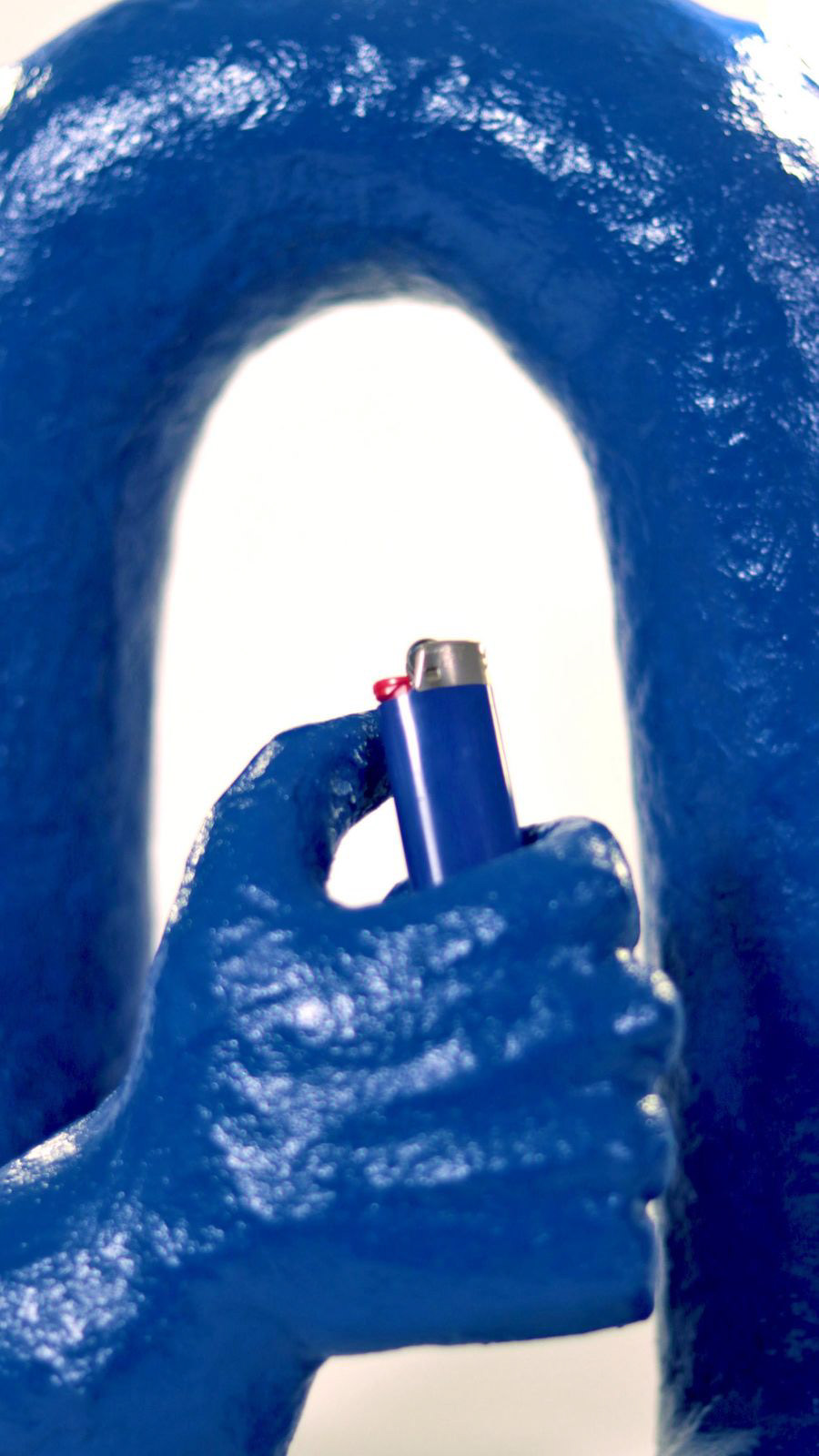 A Acesa é escultura, personagem e luminária. Um arco azul intenso com mãos nas extremidades: uma delas firme no chão, a outra segurando um isqueiro. Na parte superior, uma sequência de lâmpadas completa o corpo, como uma coroa elétrica, quase carnavalesca.